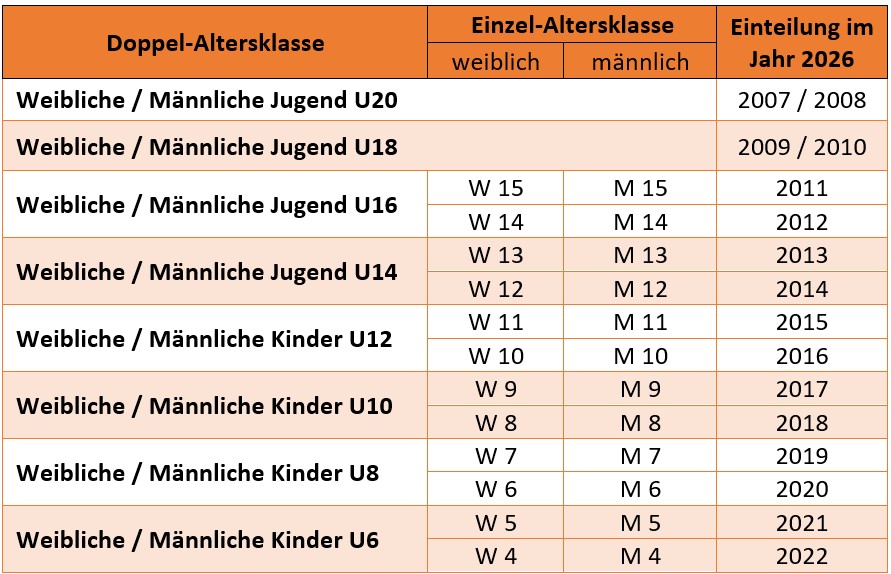 Bei den Kindern und Jugendlichen werden jeweils zwei Geburtsjahrgänge zu einer Altersklasse zusammengefasst (U10, U12 usw.). Bis zur U16 gibt es zudem auch Wertungen in den einzelnen Jahrgängen (W12, W13 usw.) - so setzt sich bspw. die weibliche U14 zusammen aus der W12 und der W13. In der U18 und der U20 gibt es keine Jahrgangswertung mehr, sondern nur noch die „Doppel-Altersklasse“.