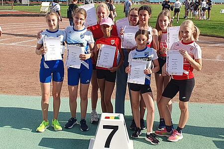 JUGEND U14: Am 1. Juni traten die 7 TSVerinnen (Amayelle, Elena, Gjamira, Lara, Larissa, Mascha, Viktoria) zusammen mit 3 SSVLerinnen bei den Berliner Team-Meisterschaften. Auch hier reichte es am Ende für Rang 7. Dabei war die StG beim Ballwurf sogar das beste Team. Beste Einzelleistung des Teams waren die 800m von Amayelle, die 2:33,60min benötigte. Damit war sie Zweitschnellste aller 31 angetretenen Mädchen – und dass, obwohl sie eigentlich noch zur Altersklasse U12 gehört! Damit unterbot sie zugleich den 19 Jahre alten Vereinsrekord der W11 um über 5 Sekunden. Eine U14-Jungenmannschaft war nach diversen Absagen nicht am Start.