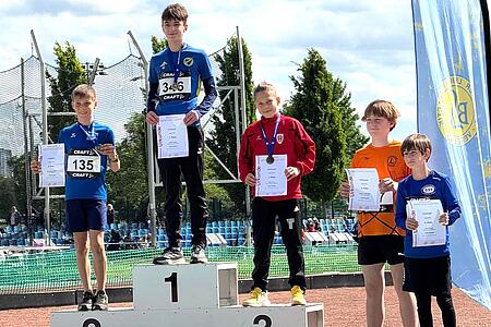 Am Samstag waren die Jungen dran, am Sonntag die Mädchen. Bei den Jungs war diesmal lediglich Mats (M12) dabei. Nach seinen bisherigen Mehrkampfmeisterschaften (2023 6. von 54, 2024 6. von 68, 2025 Halle 2. von 36) zählte er natürlich zum erweiterten Favoritenkreis. Über 75m lief er in persönlicher Bestzeit die drittschnellste Zeit der Konkurrenz, selbiges gelang ihm im Ballwurf. Im Weitsprung war er Viertbester, im Hochsprung reichte es leider nur zur 20.-besten Höhe. Da aber auch alle anderen Teilnehmer „schwächere“ Disziplinen hatten, reichte es in der Endabrechnung für Mats zu Rang 3 – also der Bronze-Medaille! Mit letztlich 1.556 Punkten lag er lediglich 10 Punkte hinter dem Silberrang, aber auch nur 41 Punkte vor Platz 7.