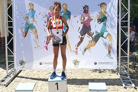 Im Block Wurf der W13 war Lara dabei. Bei 12 Mädchen startete sie eher durchwachsen in den Wettkampf. Auf eine persönliche Bestzeit über die Hürden folgte der Diskuswurf, bei dem sie mit 19 Metern knapp 7 Meter (!) unter ihrer Bestleistung blieb. Die anschließenden 75m und der Weitsprung waren in Ordnung, die letzte Disziplin (Kugelstoß) musste es also richten. Und hier blieb sie nervenstark und schaffte gleich im ersten Versuch mit 8,60m Berliner Jahresbestleistung in der W13. Damit konnte sie sich in der Endabrechnung dann doch noch auf den 3. Platz, also den Bronzerang vorschieben!