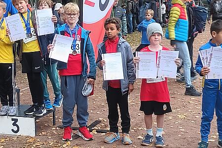 Männliche Kinder U10 (Jg. 2016/2017), ca. 1,3 km: Bei den Jungen gab es mit Noah leider kurzfristig einen schmerzhaften Ausfall, dennoch schafften es Max, Nahom und Levin in der Mannschaftswertung auf einen starken 4. Platz, lediglich 9 Sekunden hinter dem Bronzerang. Im Einzel holte Max in der M9 eben diese Bronzemedaille, Nahom wurde (bei 25 Jungen) Achter. In der M8 schaffte es Levin auf einen guten 7. Platz.