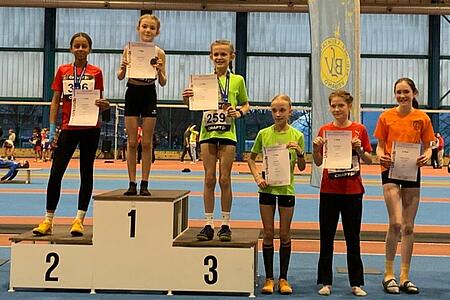 Bei den Mädchen kam krankheitsbedingt leider keine Mannschaft zustande, aber immerhin 4 Mädchen traten an. Für Amayelle war es nach ihrem Fußbruch im November eher ein Testwettkampf, den sie aber mit Bravour meisterte: 6. über 60m und 3. über 800m, nur im Weitsprung hatte sie mit dem Anlauf so ihre Probleme. Dennoch reichte es bei 43 Teilnehmerinnen für einen starken 5. Platz in der Gesamtwertung. In der W13 traten Vicky, Leila und Lara an. Bei ebenfalls 43 Starterinnen wurden es hier am Ende die Plätze 18, 20 und 29. Hervorgehoben sei, dass Leila dabei drei persönliche Bestleistungen gelangen.