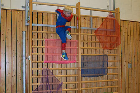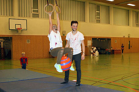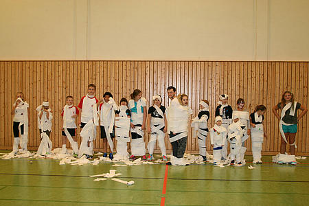 Klettern, auf dem Bauch mit einem Rollbrett Slalom fahren, mit verbundenen Händen und Füßen durch einen Tunnel robben, Zielwerfen von Mini-Taschentuchknäulen in ein klebriges Spinnennetz und balancierend mit einem Luftballon ein Gespenst ins Ziel bringen, konnte ausprobiert werden. Gemeinsam, wie im Foto als erkennbare Herausforderung, durfte sich jeder zum Schluss als Mumie wickeln.