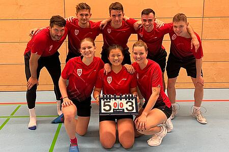 Nachdem Niko und Jeremy das 1. HD knapp mit 21:17 im 3. Satz unter Dach und Fach brachten, trieben es Sonia und Sofia im DD mit einem nervenaufreibendem 25:23 im Entscheidungssatz auf die Spitze und die Zuschauer an den Rande des Wahnsinns. Spätestens jetzt war klar, dass die Begegnung trotz der zwischenzeitigen 2:0-Führung kein Spaziergang sein würde. Bei Niklas' Debüt in der Oberliga fanden die Gegner im 2. HD lange keine Lösung gegen dessen Supersmashes, jedoch mussten sich Malte und Niklas dann doch mit 22:24 im 3. Satz geschlagen geben. Parallel dazu holte Sofia in ihrer (nur im Spiel) humorlosen und druckvollen Art nahezu unbemerkt den nächsten Punkt im DE. Das Mixed von Malte und Maren ging verloren, Jeremy gewann das 1. HE souverän und Niklas verlor sein 3. HE auch erst nach drei Sätzen. Zwischenstand 4:3... Niko hatte also das Unentschieden oder den Sieg auf dem Schläger... Verfolgt von den begeisterten Fans in der Halle und vielen zuhause am Bildschirm (großes Kompliment an die SG Tempelhof/Friedenau für eine tolle Online-Live-Berichterstattung!!!) brachte Niko mit einem Smash den Sieg im 2. HE und somit den 5:3 Gesamtsieg "nach Hause". Somit schließt unsere 1.Mannschaft die Hinrunde der Oberliga mit einem fantastischen 2. Platz ab!!!!!