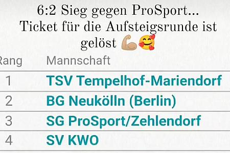 TSVTM II hat tatsächlich durch ihren 6:2 Auswärtssieg bei KWO II noch eine Minimalchance bewahrt, im Rennen um den Aufstieg zur Berlin-Brandenburg-Liga mitzumischen. Im letzten Spiel der Saison kann noch der vor ihnen stehende Drittplatzierte aktiv überholt werden. Platz zwei ist jedoch nur durch starke Schützenhilfe zu erreichen...