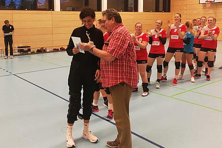Unsere liebe Cris zog sich im Vorbereitungsturnier in Potsdam einen Kreuzbandriss zu und wurde schon erfolgreich operiert. Damit die Ehrung eine Überraschung wird, wurde Sie für unser Heimspiel am Schreibertisch mit eingesetzt. Es hat wunderbar funktioniert.
