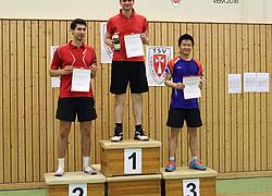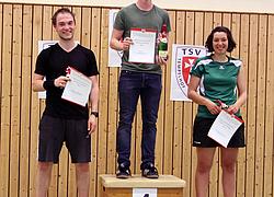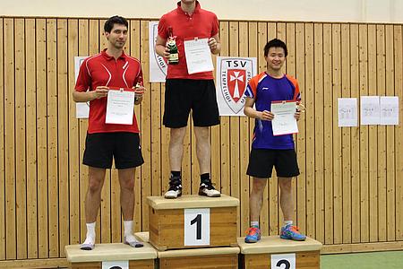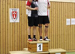 Bei den Herren wurde aufgrund der großen Teilnehmerzahl von 20 zunächst eine Qualifikationsrunde ausgetragen. Leider schafften es Matthias, Mengzhen, Dario und Maxi nicht in die Hauptrunde der Herren, lieferten sich aber danach spannende Spiele im Gruppensystem um die Plätze 17 bis 20. Die oberen Plätze der Herren waren ebenfalls hart umkämpft. Besonders das Halbfinale zwischen Malte und Yang war badmintontechnisch ein absolutes Highlight, in dem sie alles zeigten was unsere Sportart so attraktiv macht. Letztendlich landete Yang auf dem dritten, Malte auf dem zweiten und unser Trainer Alex auf dem ersten Platz.
