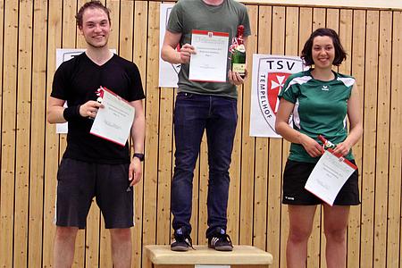 Auch bei den Freizeitspielern war es ein erfolgreicher Tag. Insgesamt sechs Teilnehmer/-innen gingen an den Start. Sie spielten mit großer Motivation ebenfalls wie die Damen eine Gruppenphase mit anschließenden Platzierungsspielen. Nach vielen spannenden Matches wurde Feli Drittplatzierte, Martin W. Zweitplatzierter und Timo Erstplatzierter.