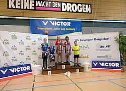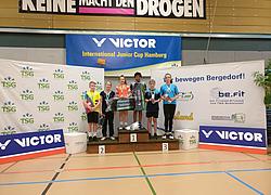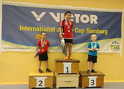 Als erstaunlicherweise einzigen der ganzen Gruppe, mit voller Energie und rumtoben, auch zwischen und nach den Spielen (auch ihr Schlafmangel war ungewohnt), spielten Trung und Gregory erstmalig Doppel. Sie bestritten nicht nur erstmalig die für beide enormen Herausforderung zu zweit auf dem Feld zu stehen. Komische, noch ziemlich unbekannte Regeln mit Aufschlagwechsel, Bälle die beim Aufschlag eigentlich drin schienen, plötzlich aber als Aus gewertet wurden. Wer nimmt den Ball, wer sollte sich wo hinstellen und warum steht mein Partner plötzlich neben mir?! "Den hab ich gar nicht gesehen!" Ehrgeizig wurde auch einmal der Ball angenommen, der beim Aufschlag eigentlich dem Partner galt. Hinzu kam die Herausforderung als einzige U9 Starter mit den U11er in einer Gruppe spielen zu müssen. Allen Herausforderungen getrotzt erkämpften sich die beiden in jedem Spiel zweistellige Punkte und konnten die" Großen" zum stauen bringen und viel Lob einheimsen. Leider nicht einzeln in ihrer Altersklasse bewertet, durften die beiden aber mit auf das Podium und erhielten ein kleinen Trostpreis.