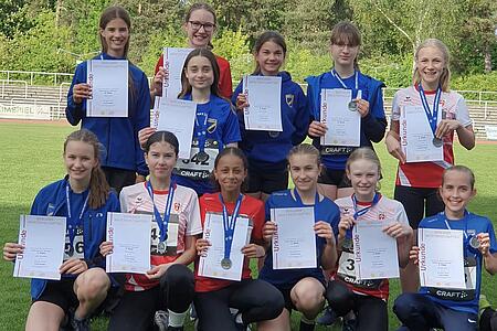 Nach Rang 7 im Vorjahr wurde in diesem Jahr bei 10 teilnehmenden Teams mit Platz 4-5 gerechnet. Mit durchweg starken Leistungen konnten die Mädchen dies sogar noch übertreffen – mit letztlich 6.335 Punkten erreichten sie die höchste SSVL/TSVTM-Teampunktzahl seit dem Jahr 2017! Belohnt wurden das Team mit der Silbermedaille und der Vizemeisterschaft. Im Ballwurf waren sie sogar das stärkste Team. 9 der 10 TSV-Leistungen schafften es in die Teamwertung, darunter der Ballwurf von Gjamira, der Hochsprung von Leila und die 800m von Amayelle. Die höchsten Einzelpunktzahlen im Team erreichten Vicky im Ballwurf und Lara über die Hürden. Und die 1. Staffel mit Vicky, Amayelle, Leila und Lara lief sogar einen neuen StG-Rekord – obwohl keiner der drei Wechsel so richtig gut war…