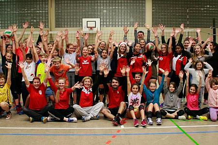Eltern auf Socken, kleine Profis in roten Trikots und viele herumhüpfende Geschwisterkinder - es war ein wildes, lautes und wundervolles Getümmel in der Halle. Unsere Trainerinnen Lydia und Milena koordinierten die verrückten Horden in sechs bunt gemischte Mannschaften aus Eltern, Jungs und Mädchen und ließen die Mannschaften in Vor- und Endrunde gegeneinander antreten. Die danach feiernden Mädchen der U16 und U18 halfen mit dem Punktezählen aus und auch TM1 schickte etwas Hilfe vorbei.