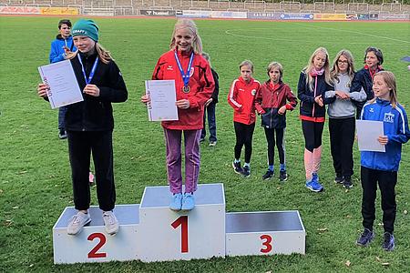 In der W11 kam Elena als beste TSVerin auf Platz 13, in der W10 wurde Leila Elfte. Und Viktoria … die lag nach Sprint und Weitsprung nur auf Rang 10, konnte aber dank ihres sehr starken Ballwurfs am Ende sogar das Siegerpodest als Erste besteigen: Mit neuem Vereinsrekord von 1.174 Punkten wurde sie BERLINER MEISTERIN.