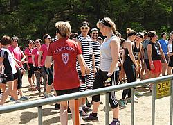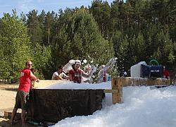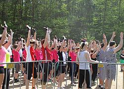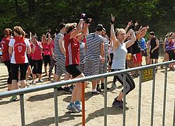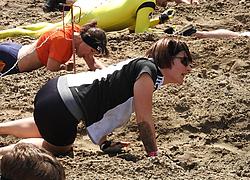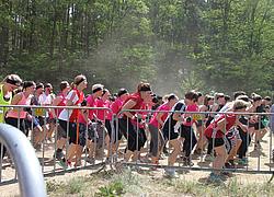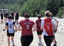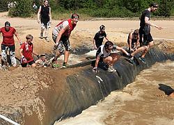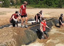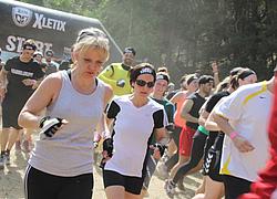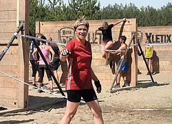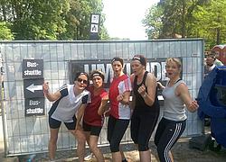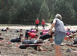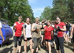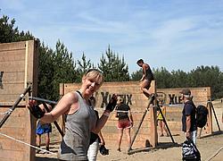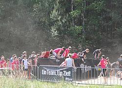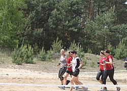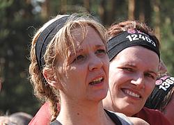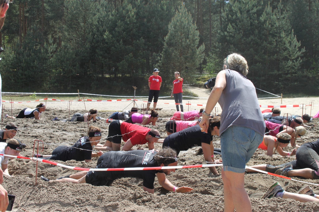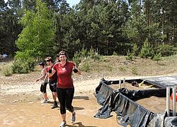 Die Damen absolvierten diese Herausforderung bravourös, wenn man bedenkt, dass keine von Ihnen Geländelauf trainiert hatte. Denn sie mussten feststellen, dass die gesamte Laufstrecke durch Märkischen Sand (das ist wie Buddelkastensand) bergauf, bergab, über Stock, Stein und Wurzeln führte, was sich mit den nassen Schuhen, durch die diversen Wasserhindernisse etwas schwieriger gestaltete. Besonders stolz sind sie, weil sie bis auf 1 Hindernis, nämlich die 4,5 m hohe Pipe, alle anderen bezwungen haben (wie das Eiswürfelbecken, Netzklettern, 3m hohe Holzwand, etc.).